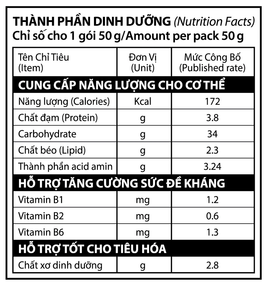 - Nutritious seasoning package: Iodized salt, sugar, yeast extract (0.9 g/50 g), seafood extract (0.6 g/50 g), onion powder, garlic powder, soy sauce powder, pepper powder , dried scallions, vitamins (B1, B2, B6), fiber.