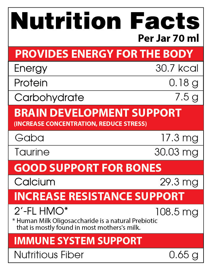 Ingredients: Water, bird's nest (18%), rock sugar, fiber, canxi lactate, agar (INS 406), PharmaGABA, 2'-Fucosyllactose (2’-FL) (oligosaccharid), stabilizers (INS 401, INS407), synthetic flavoring (elder flower flavor), taurin.